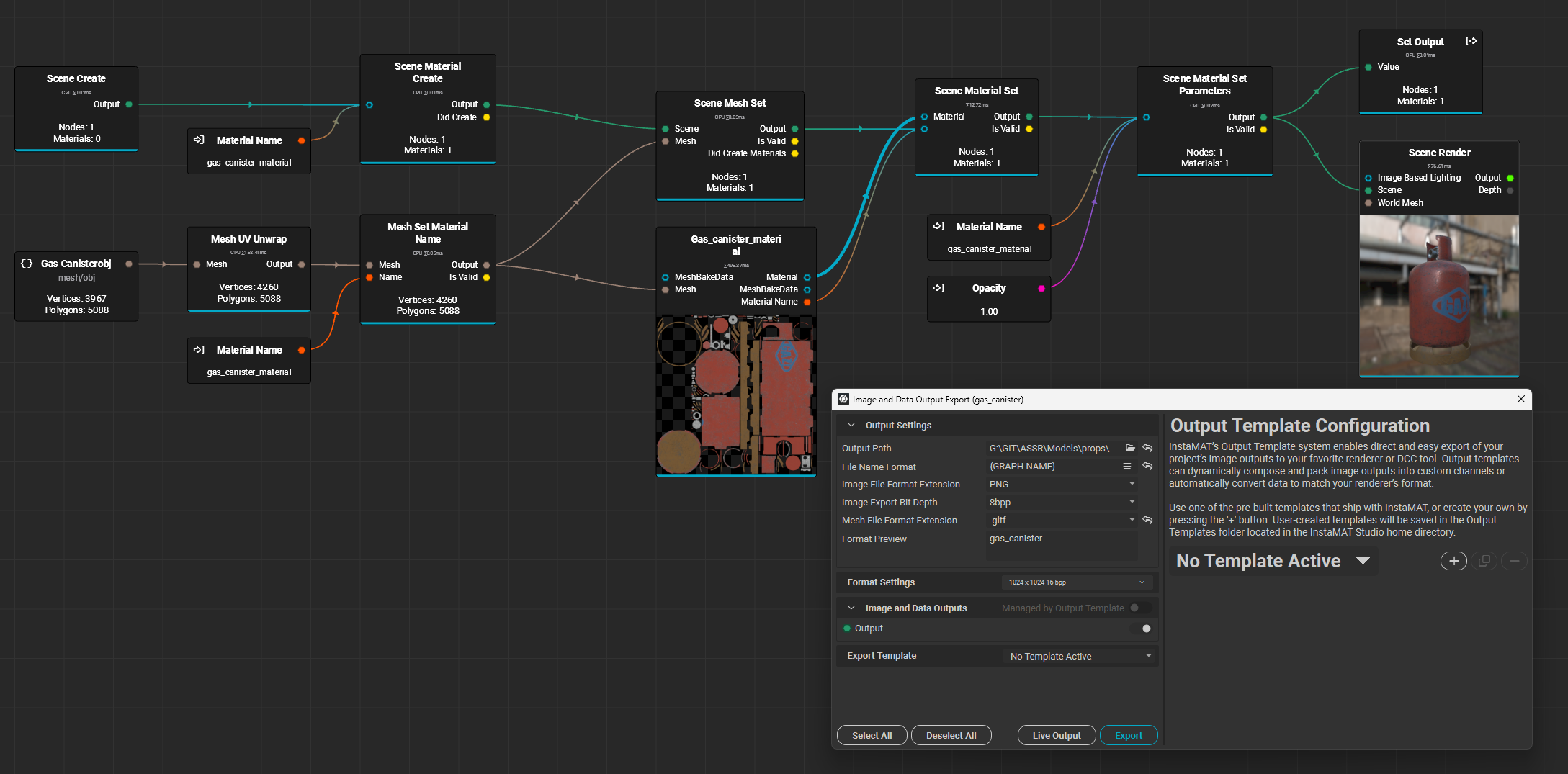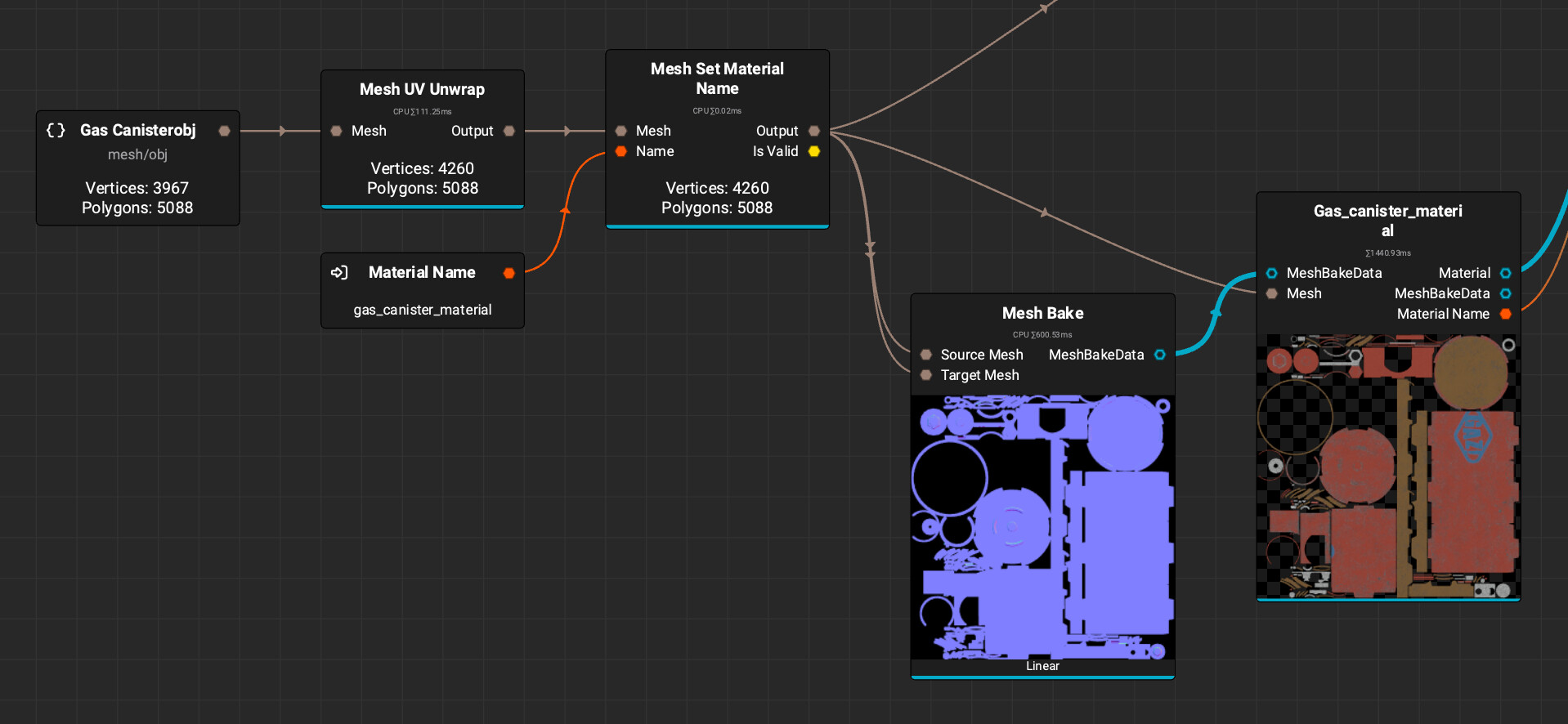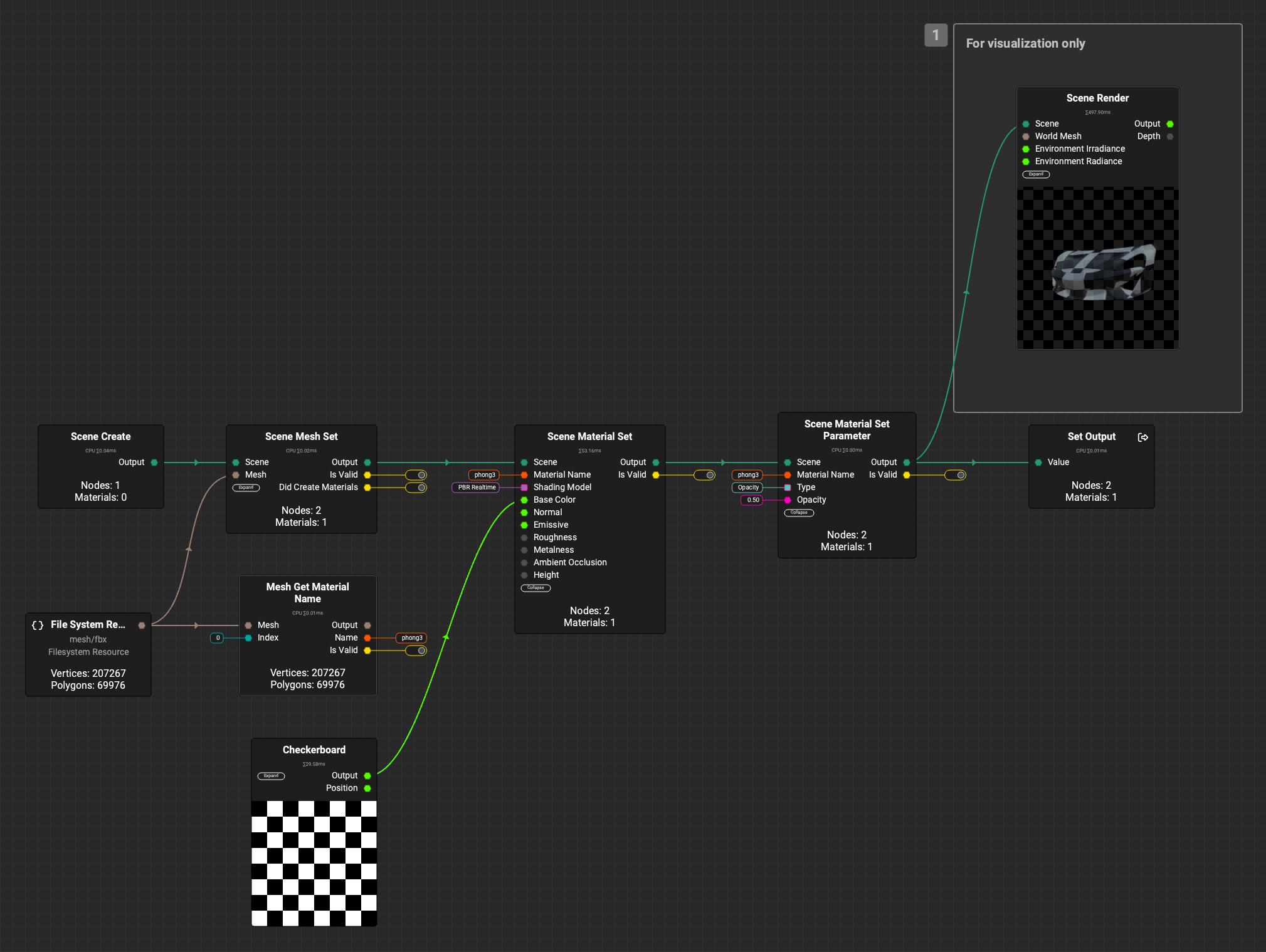 In this case, the Scene Material Create node is not necessary because you already have a material slot on the mesh, and you’re setting the name with the Mesh Set Material Name node for the first material index.