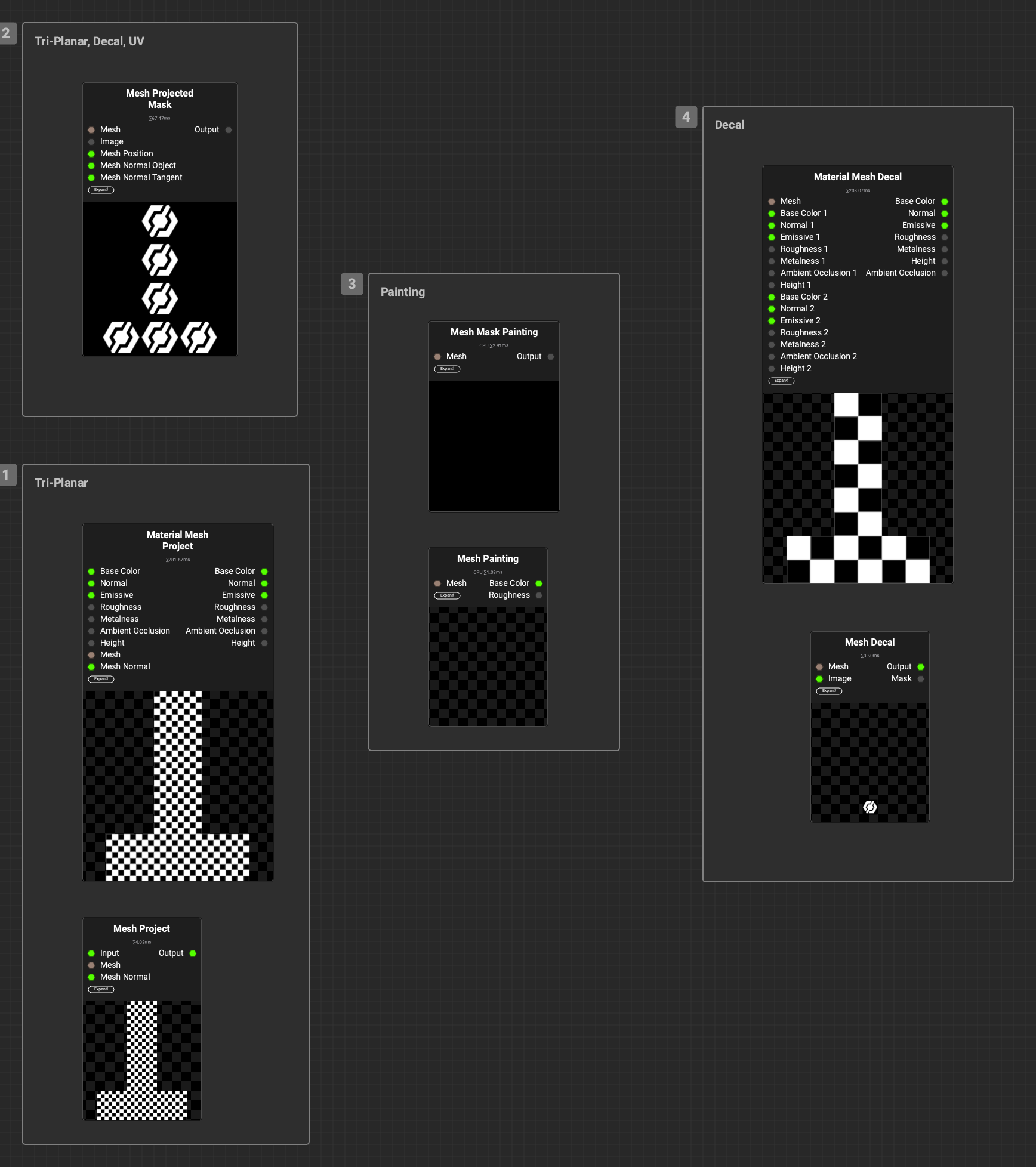 For the projection nodes, you can drag a mesh into the graph, then connect it to a node’s Mesh input. Some nodes ask for baked mesh maps. You can generate these with the Mesh Bake node.