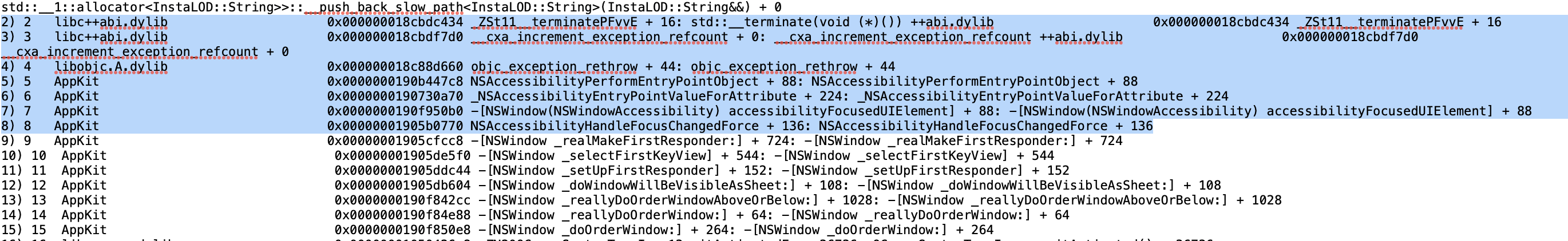 Hello @caroline thanks for the bug report! This seems to be a crash in the accesibility portion of MacOSā internals. Is it possible that you have some accesibility plugin installed or some accesibility features activated in the OS settings? It might also be a setting in the āPrivacy & Securityā OS settings.