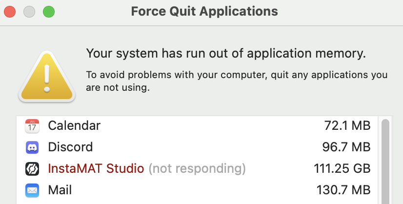Edit: I accidentally left it running without force quitting and came back to this: