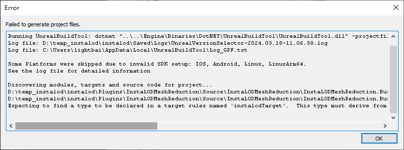 Expecting to find a type to be declared in a target rules named 'instalodTarget'. This type must derive from the 'TargetRules' type defined by Unreal Build Tool.
