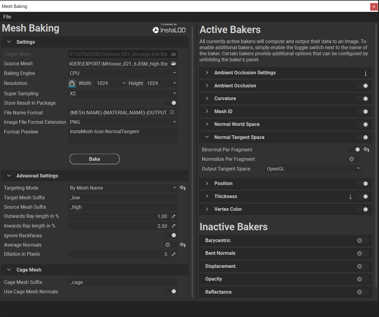 Hello, I hope everyone is doing well. I have not been able to get a successful bake without errors in a Layer project when using a file containing cage meshes. The target .fbx file contains 11 meshes with the suffix “_low” and a polycount of 5,638 tris, along with 11 corresponding cage meshes inside the same file with the suffix “_cage”. The source mesh has 11 meshes with the suffix “_high” and 12.9 million tris total, but I also tried a 6.9 million decimated version, both having the same result when baking via the “By Mesh Name” targeting mode.