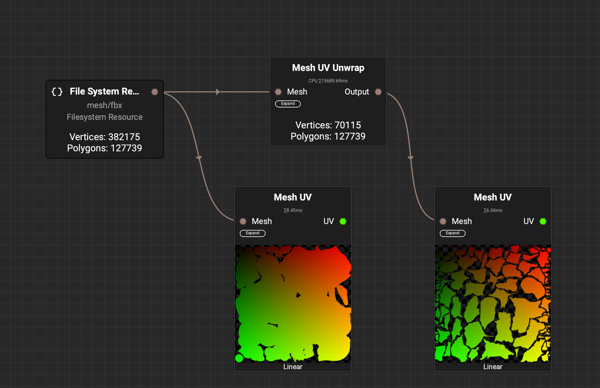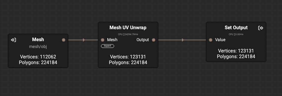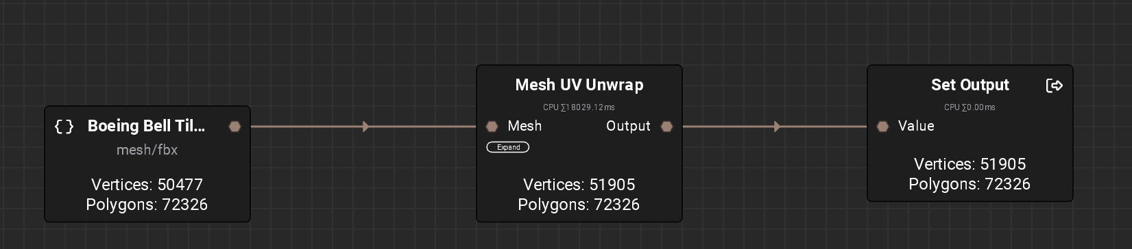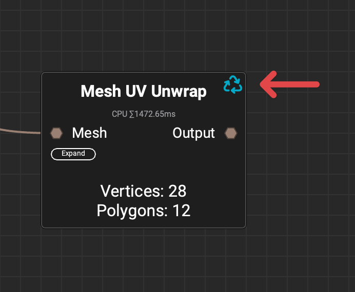 Here’s an example of looking at the UVs before and after the Mesh UV Unwrap node.