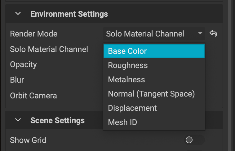 In addition, you can also view a particular channel by selecting it in the Viewport Settings panel. After setting the Render Mode to Solo Material Channel, a dropdown will appear allowing you to choose which channel to view in the 3D viewport.