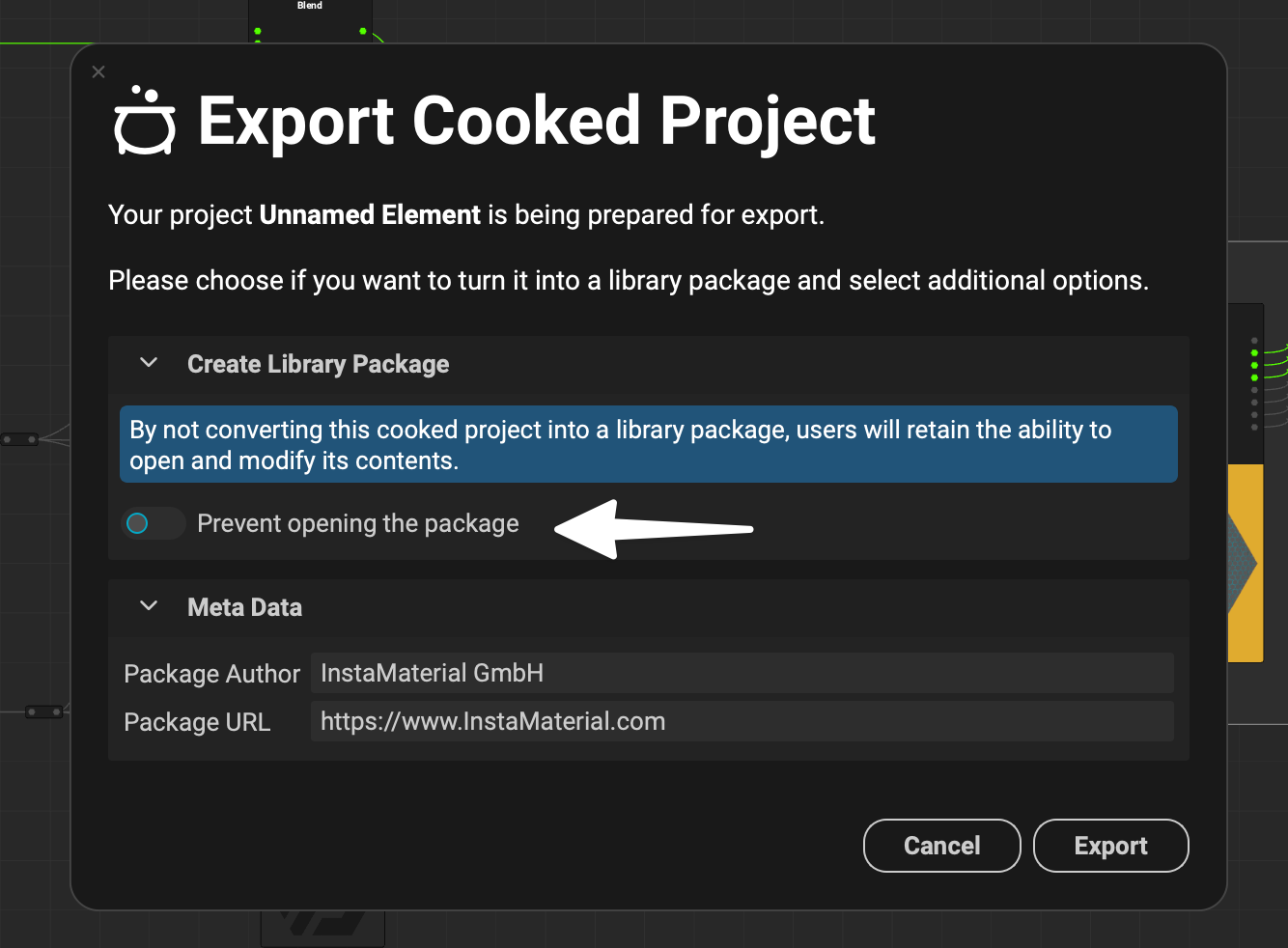 To export a cooked version you can do so from File > Export Cooked Project. Please make sure to disable Prevent opening the package from the Export Cooked Project dialog so that we’ll be able to open it.