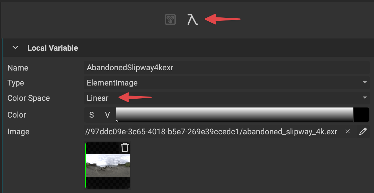 Make sure the ElementImage input for your custom environment image has its color space set to Linear for proper visualization. If not done automatically, this can be assigned by clicking on the input node in the graph and changing it in the Graph Variable Editor panel.