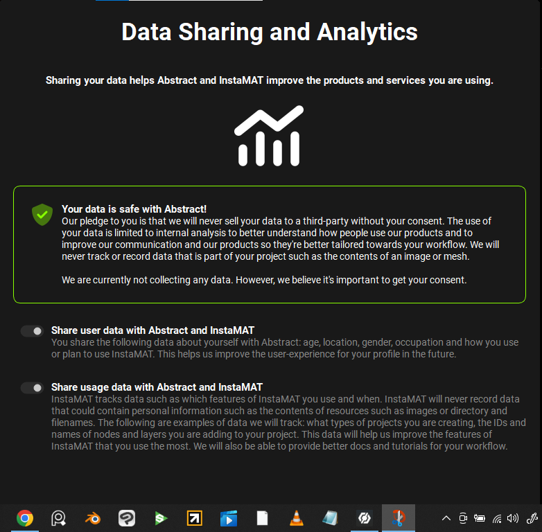 As depicted in the screenshot, the “Data Sharing and Analytics” window clips past the bottom of the UI. Scrolling down and moving the window up yielded no results as the window will simply reset to its previous position, making it impossible to access InstaMAT.