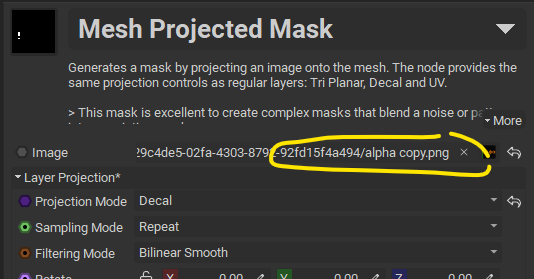 I think what you want to do here is to use a regular fill layer and then apply a mask called “Mesh Projected Mask”. You can now setup your alpha on the projected mask, and set it’s type to be a decal. You can position it the same, but you can now specify custom properties for roughness, metalness etc.