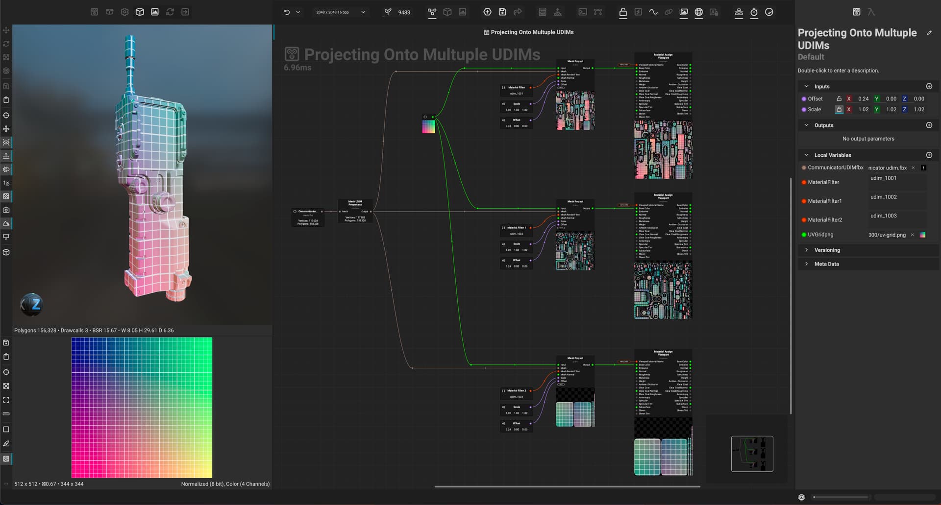 Notice in this example, I’ve driven the Scale and Offset parameters for each Mesh Project node to a graph input so that I can control all of them at the same time. You can also create local variables for the mesh render filter values for each tile if you need to reuse them in multiple places.