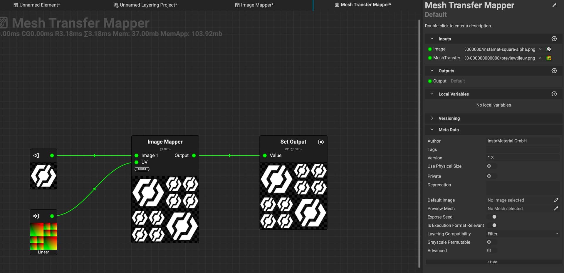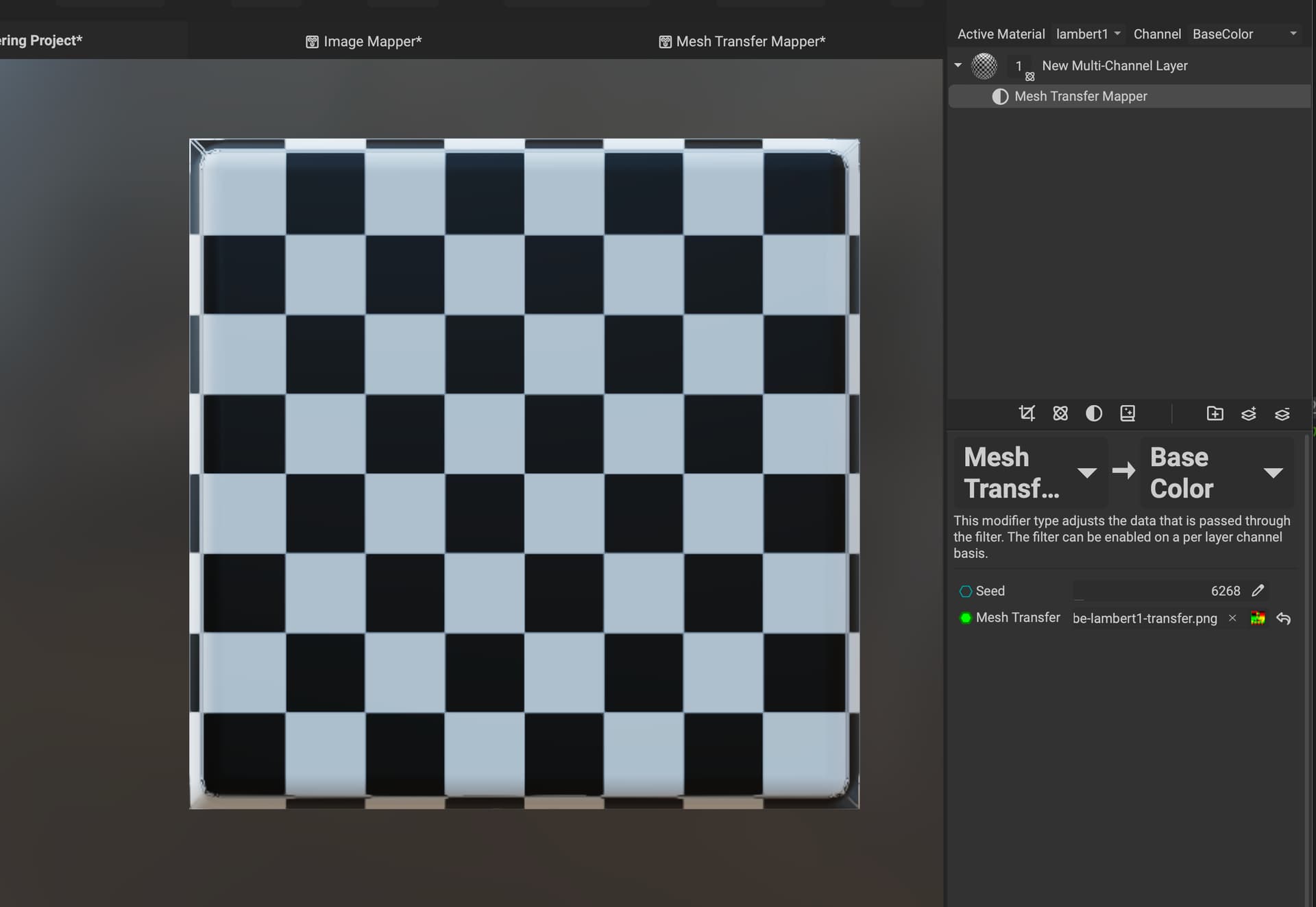 However, you can bake a “Transfer” map and use it with the “Image Mapper” to map the source texture to the target mesh. The source texture in this example is the checkerboard. Make sure to use the “CPU” baker, the texture sampler is not yet supported in the “GPU” baker: