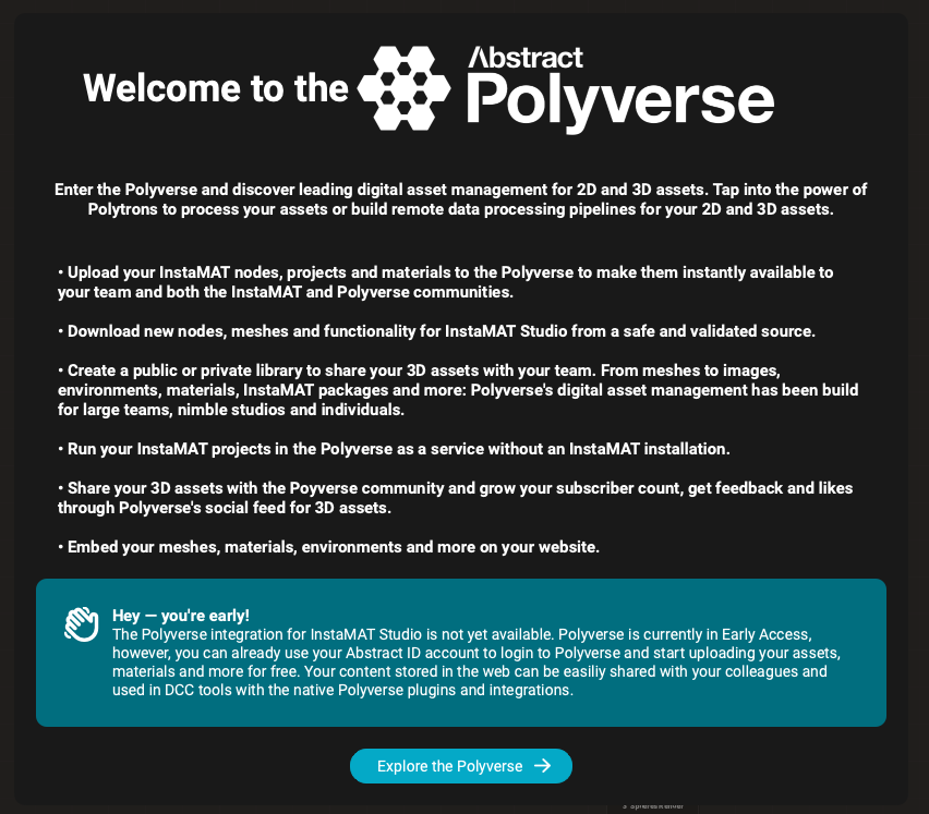 Polyverse is currently in Early Access and the integration for InstaMAT Studio is not available yet. However, when it is it will be possible to download new nodes, meshes and functionality for InstaMAT Studio. As for now, you can already login to Polyverse and start uploading your assets, materials and more for free!