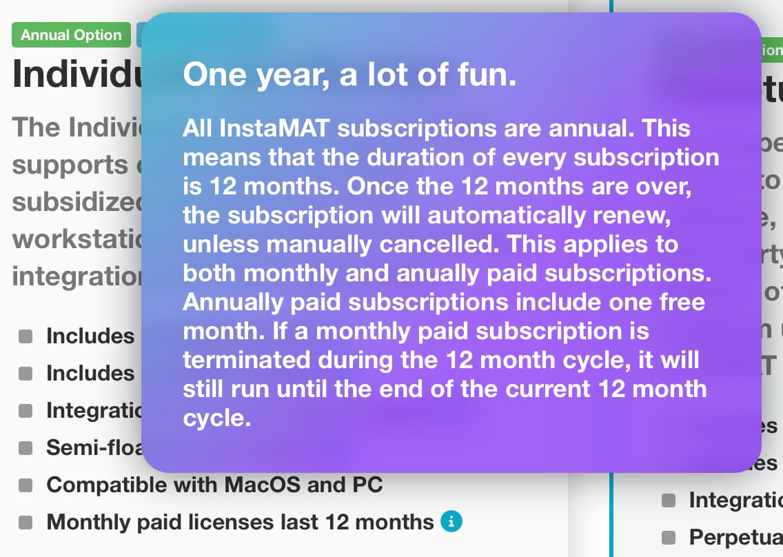 According to the official website, all InstaMAT subscriptions are annual. This means that if you cancel in the middle of the term, it will still run until the 12 month cycle is over.