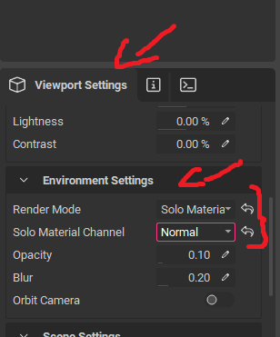 Alternatively, you can go to “Viewport Settings” and, under “Environment Settings,” change the “Render Mode” to “Solo Material Channel.” A new setting will appear, allowing you to choose the specific channel you want to preview:
