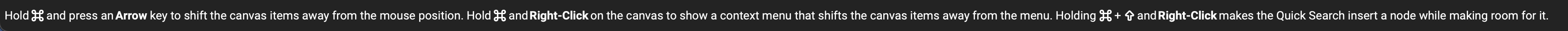 In the meantime, the status bar at the bottom is adaptive and displays relevant keyboard shortcuts. If you hold Cmd/Ctrl it will mention additional node organization shortcuts such as the ability to shift nodes with a contextual menu, and an option for the graph making room for nodes automatically when using Quick Search.