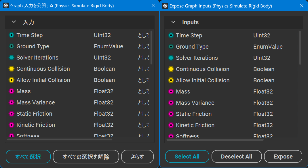 Expose Input Parameters / Expose Output Parameters popup window buttons use the unnatural word ããã.