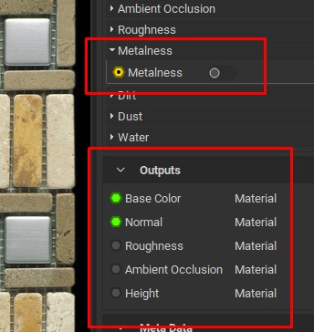 Enabling the Metalness switch allows InstaMAT to designate where metallic surfaces are for the PBR material by either using a color from the input image or a provided mask input. Disabling the switch leaves the metalness map as black making it so that there are no metallic parts of the material. PBR materials require a metalness channel, and black is considered valid information.