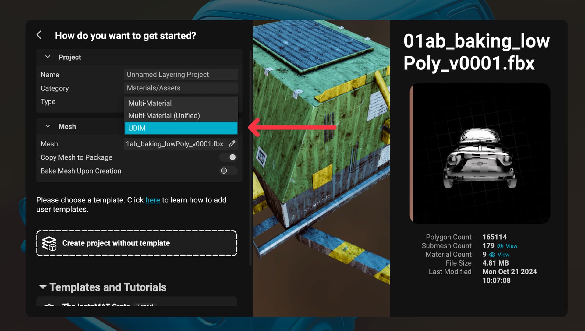 Multi-Material (Unified) mode brings the UDIM workflow to meshes configured for multiple material sections/texture sets. In this case, the model is set up with multiple UDIMs, so it showed unexpected results when texturing with that Layering project type.