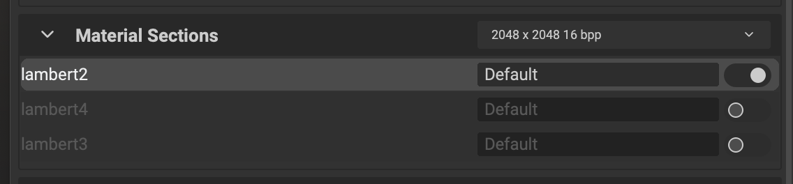 You can select which material sections/texture sets you would like to export in the Image and Data Output Export panel by enabling or disabling the toggle next to each material section.