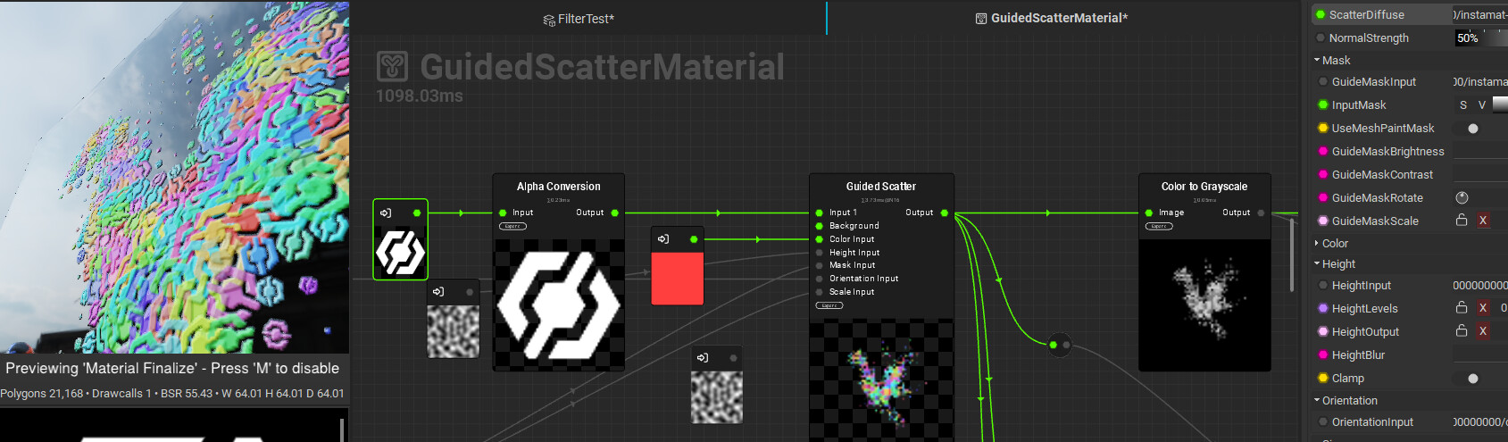 Based on the “guided scatter node”, I wanna make a customizable material layer to add stuff like tattoos or skin paint, ornamental details, but also skin blemishes or damage. Ideally they should be based on other elements I could just drop in, kinda like decals: Including base color, roughness, height/normal and opacity mask.
