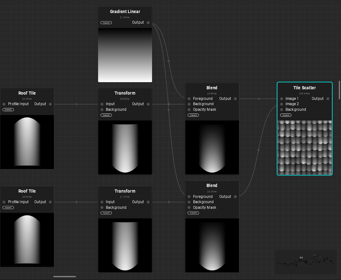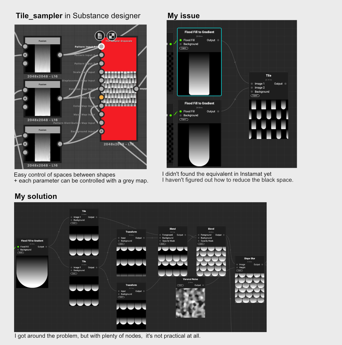 Up to know I didn’t found the good tiling node to replace the Substance Tile_sampler for roofs or special wall or any repetitive structure based on several sources. I send a picture to better explain my problem, I’m almost sure I missed something and there’s a simple solution