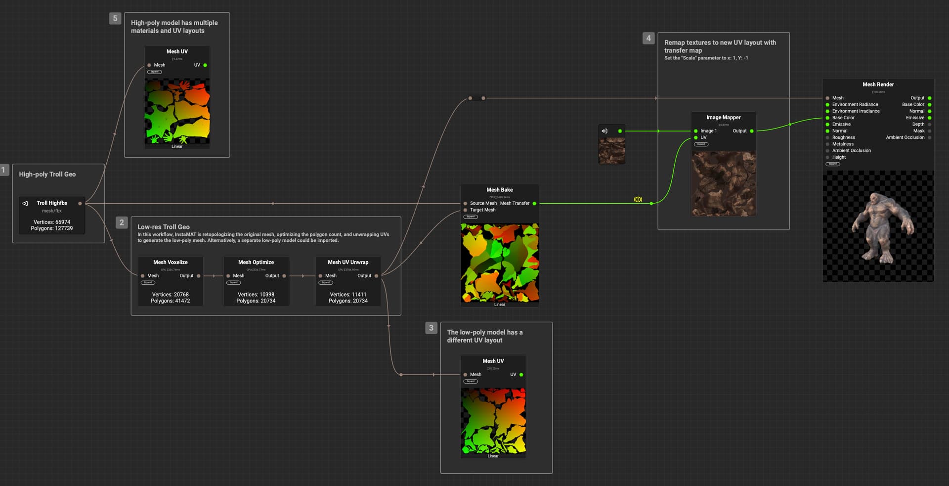 Here’s an example of this workflow in action. In addition to transferring textures, it also creates the low-poly model and unwraps the UVs. Once the graph is created, you can re-use it by changing the input mesh at the beginning, and inputting another base color texture input.
